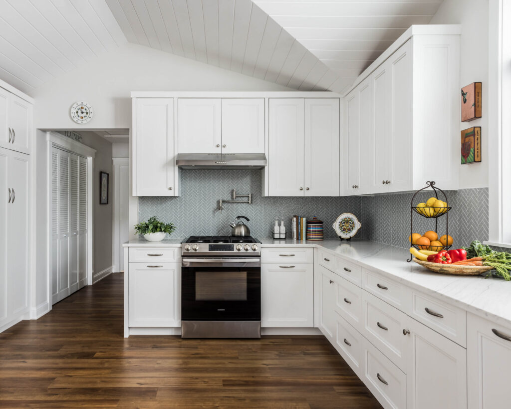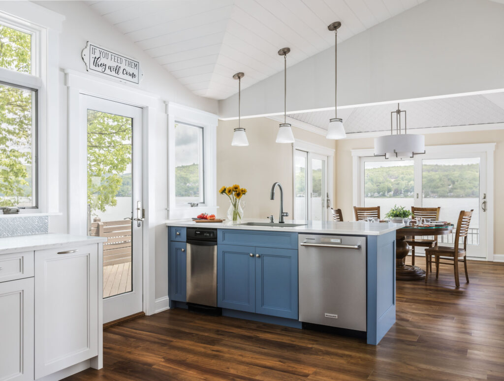 To open up the main living space, we removed a structural wall in the center of the living room, allowing for uninterrupted sightlines to the water. We streamlined the oversized fireplace, reducing its depth to sit flush with the wall—creating more usable living space. In the kitchen, we raised the ceiling, reconfigured windows, and designed custom cabinetry for a bright, functional layout that supports everything from family meals to summer entertaining.