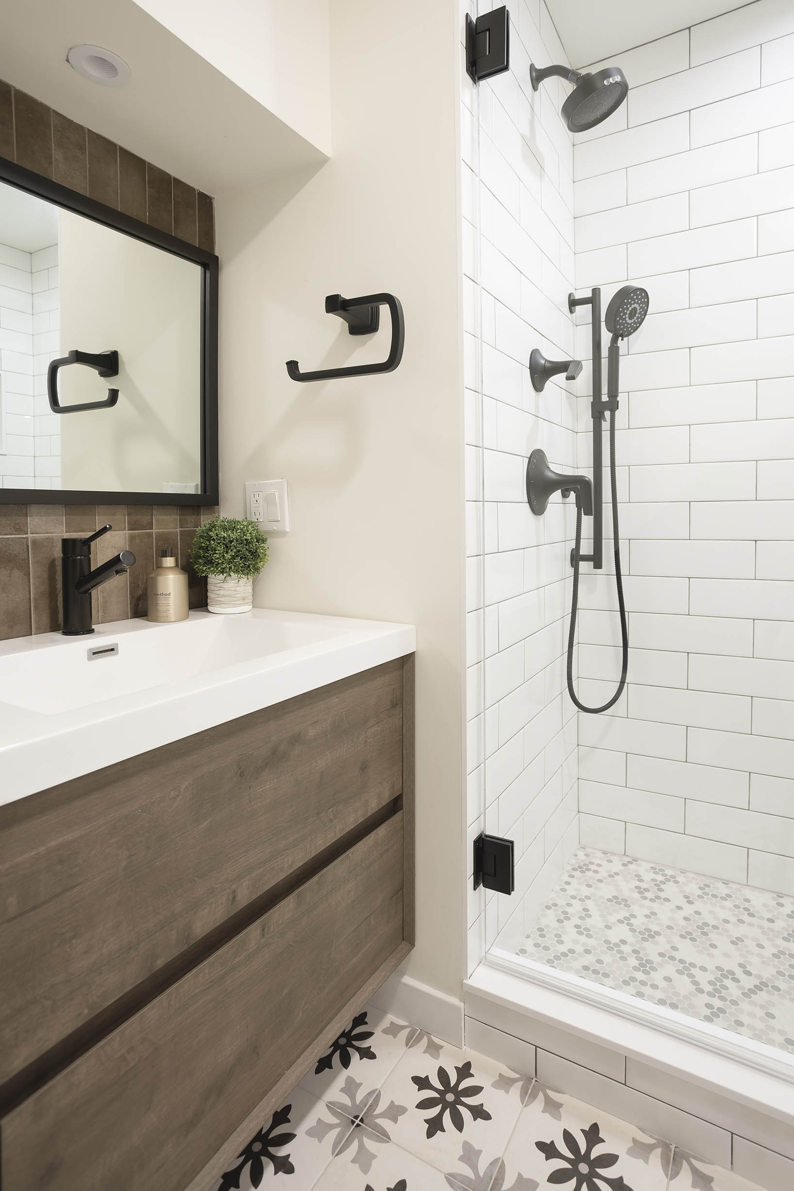 Next, we reimagined the space by removing a window, installing a larger shower and double vanity with a taller backsplash, adding a linen closet with toilet, as well as incorporating upgrades like a towel warmer and an organic lighting fixture for a modern, spa-like look and feel.